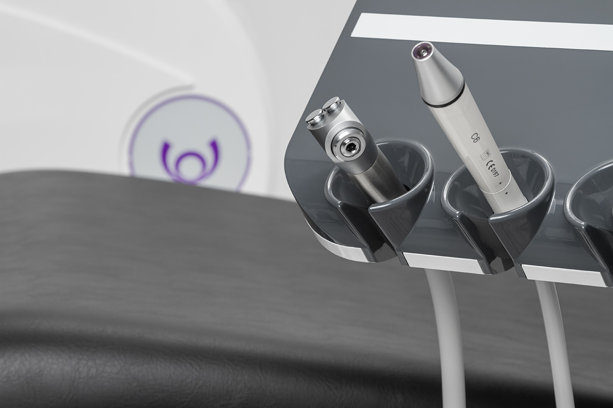 Многие стоматологи выбирают именно нижнюю подачу потому, что так пациент не видит инструментов и не испытывает напряжения. Кроме того, модуль располагается довольно низко и за инструментами не нужно далеко тянуться. Модуль врача рассчитан на 6 инструментов, он имеет пульт управления креслом.